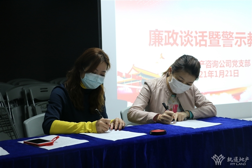 活動中,軌道地產(chǎn)咨詢公司黨支部書記、董事長劉燕組織與會人員學習了《關于兩起違反中央八項規(guī)定精神問題典型案例的通報》等相關文件,并集中觀看了警示教育片《縣委書記為何滑向深淵》。軌道地產(chǎn)咨詢公司各部門、各項目負責人還與黨支部書記劉燕簽訂了《黨風廉政建設承諾書》。